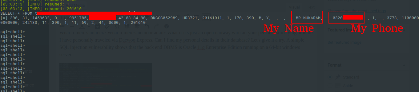 What if there’s no lock? What if there’s no door at all? What if it’s just an open hallway with all your personal stuff lying around? I have personally traveled via Daewoo Express. Can I find my personal details in their database? Let’s give it a try. A simple SQL Injection vulnerability shows that the back end DBMS is Oracle 11g Enterprise Edition running on a 64-bit Windows server.