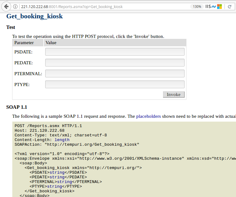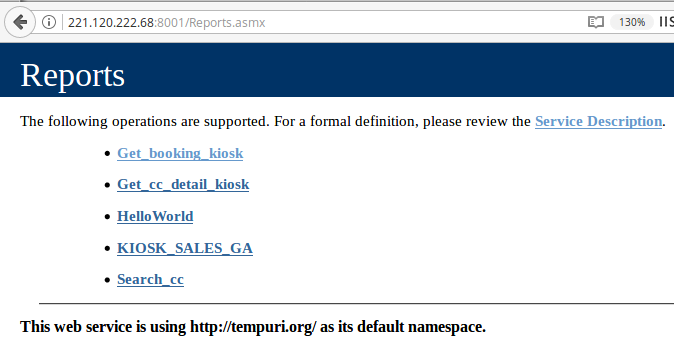 Who doesn’t like ports? Ports are the endpoints of communication and this IP address has a lot of ‘em. HTTPD service is running on about 60 different ports. The default port is for the ticketing portal where an end user can select routes, departure times, locations etc. Do you want to see what’s running on other HTTPD ports? I know, I do. First port 8001 shows a WSDL (Web Services Description Language) page.