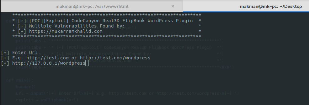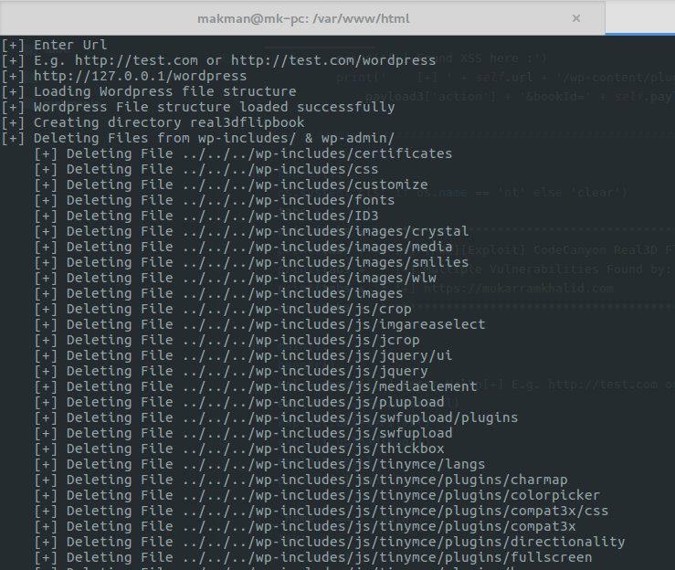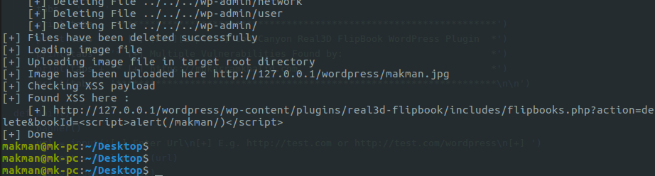Here comes the fun part, I’ve coded a POC in Python which exploits all these vulnerabilities for the given website. It deletes all the important files in wp-content/ and wp-admin/ thus breaking the wordpress installation. Then, it uploads an image makman.jpg in the root directory of the website and finally checks the XSS payload. Here’s the code.