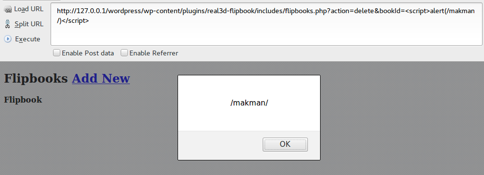 This vulnerability exists in wp-content/plugins/real3d-flipbook/includes/flipbooks.php where unsanitized user input is directly echoed on the page. An end user can exploit this vulnerability by simply making a GET request to flipbooks.php with GET parameters action=delete&bookId=<script>alert(/makman/)</script>.